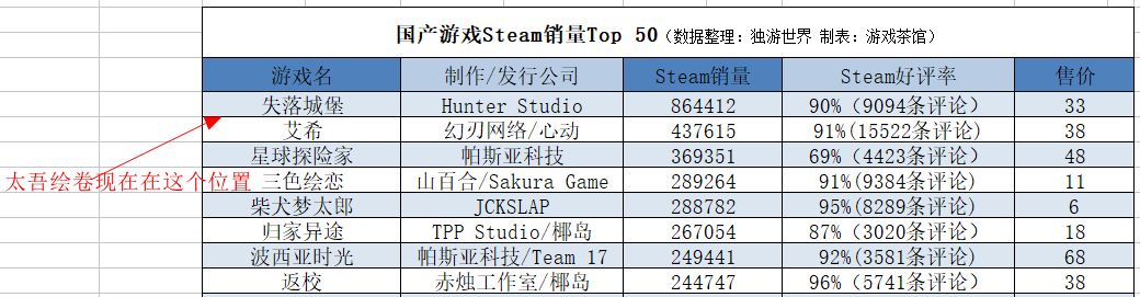 据《太吾绘卷》开发商螺舟工作室,游戏在上线15天销量达到了60万套。这个数据在此前7月整理的Steam国产游戏销量排行榜,已经排名第二位,仅次于《失落城堡》(86万销量)。