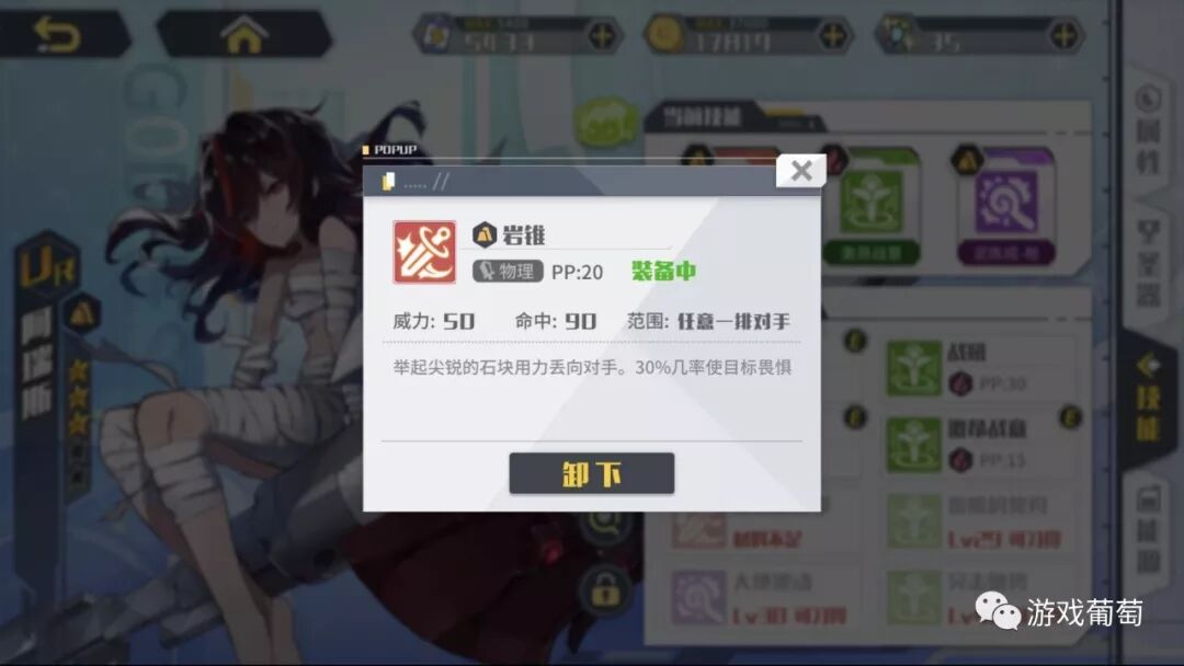 技能随等级提升而解锁,由于每个角色的技能总共可以学习8种,但实战中只能携带三种,所以技能的搭配极为重要。比如物理输出和魔法输出的搭配,buff和debuff的选择(攻防速增减、魔攻魔防增减等),特殊效果的选择(如30%使对方畏惧、诅咒等),攻击范围的选择(单体、群体、自身、己方指定)等。