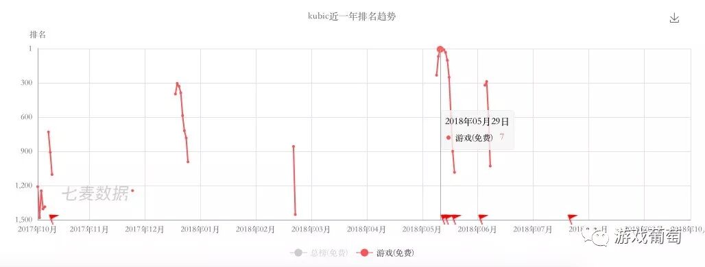 此外,一款名为《kubic》的方块拼图类游戏曾在5月份迎来短时间的爆发。该游戏最初于2016年7月上线,2017年10月推出新版本后一度停更数月,免费榜中也几乎没了他的影子。随后,凭借独特的视觉错觉设计和艺术属性,游戏获得抖音用户的青睐,交出了免费榜第7的答卷。不过一周后,游戏很快又滑落出了免费榜,整个过程堪比过山车。