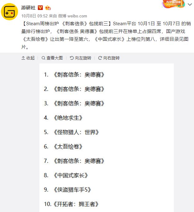 上周有两个有趣的新闻跟《刺客信条:奥德赛》有关。一条是说《刺客信条:奥德赛》的在线人数创新高,Steam的统计显示,《刺客信条:奥德赛》发售最初几天内最高同时在线人数超过6万人,是前作《刺客信条:起源》最高记录的1.5倍。这紧跟着带出了第二条新闻:最新Steam销量榜,《刺客信条:奥德赛》狂揽前三。