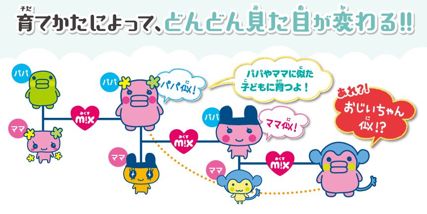 这一代追加了结婚/育儿的新玩法,可以与其他用户培育的宠物结婚,有各自不同外形特征的拓麻歌子生下的孩子也会根据父母的基因获得遗传。