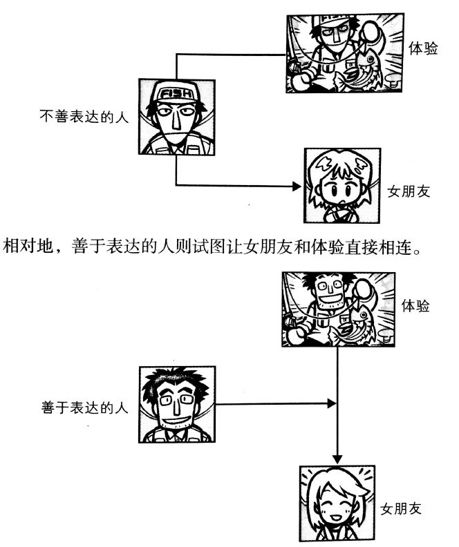 但是从第二句开始,就出现了命运的分歧点。不善表达的乙一开始就把“钓到大鱼”的事实放出,瞬间结束了话题;善于表达的甲非但没有把结果告诉女友,还不断吊她胃口,讲述故事的过程。
