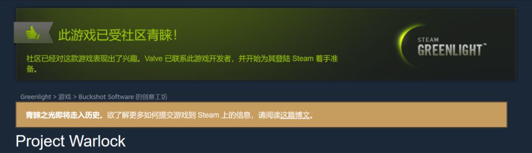 虽然《Project Warlock》已经决定由GOG独占发行,但在steam青睐之光仍然可以看到它的历史界面,Jakub Cislo正如自己所说,在坚持不懈的改进后让hater们无从抱怨,现在评论区是大批的好评,还有在页面上方挂着的“此游戏已受社区青睐”。