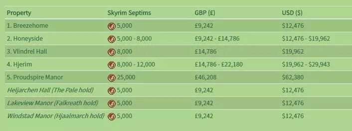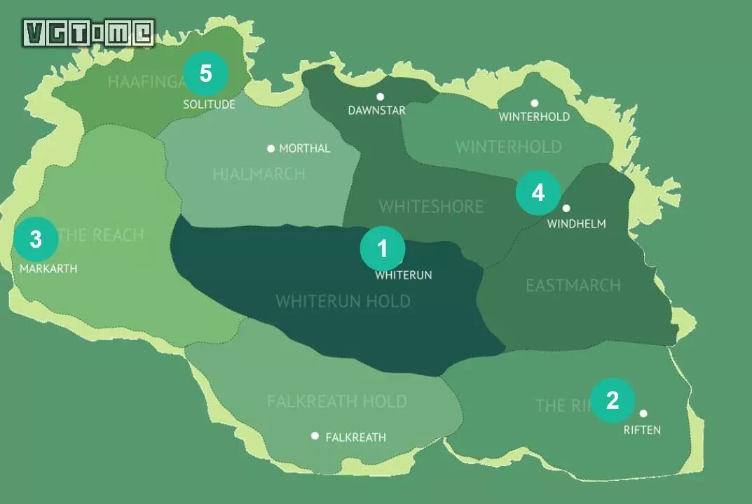 在天际省,你可以在以上五处地点购入房产,其价格根据你是否需要装修而产生变化。分别是: