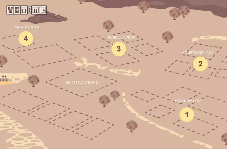 Sage Estates:整个柳溪镇最富裕繁荣的街区,就是这儿了。你必须得出现在小镇的富人榜前列,才有可能购入这儿两栋房源中的任意一间房间。这儿的房子似乎都在对你说,努力赚钱吧!