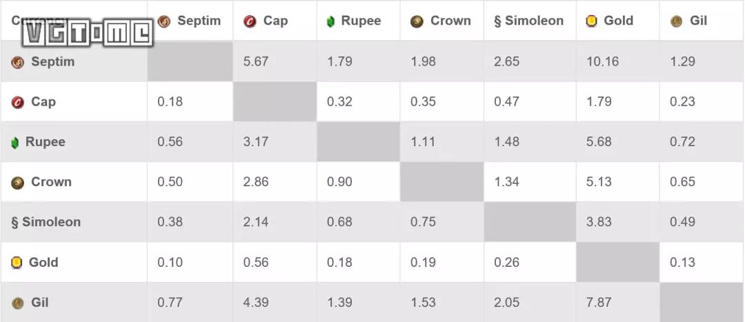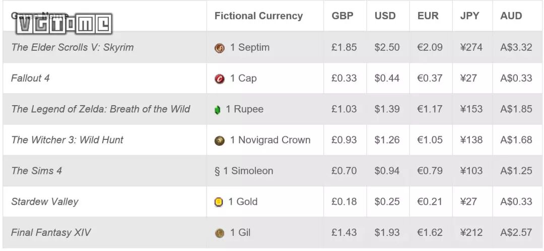可以看到,游戏内“最贵”的货币为《上古卷轴5 天际》中的赛普汀,1赛普汀可兑1.85英镑。而“最便宜”的则是《星露谷物语》中的金币,一个仅兑0.18英镑。