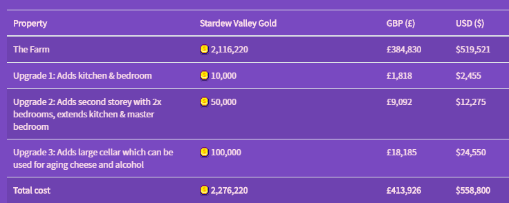 跟《巫师》中的葡萄园一样,我们无需花费金钱来买入农场,所以我们只能推测农场在现实生活中的价格。方法基本跟《巫师》类似,也是通过调查均价和面积,相乘获得总价(现实生活中类似农场的价格),并再通过算得的汇率来推断其在游戏中的价格。