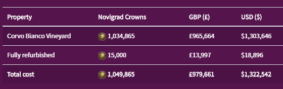 如图可见,葡萄园本身大概需要1034865克朗,翻新费用大概在15000克朗左右,总计费用为1049865克朗左右,换算成美元的话,则约为132万左右。