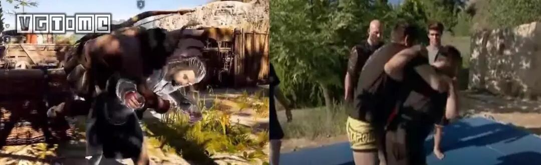 实际上,潘克拉辛所推崇的摔技,在《刺客信条 奥德赛》的刺杀动作中很容易就能看到。比如利用手臂来锁住敌人的喉咙,或是下潜后拉住对手的单脚,并使用类似于柔道“固浮”的压制动作。处于近身会缠抱状态时,还有一招名为“Ripsi Omoui”的过肩摔,核心要点是抓住对手的一只胳膊当杠杆,然后靠住自己的背部作为支点,并向前投出使其失去平衡而摔倒。