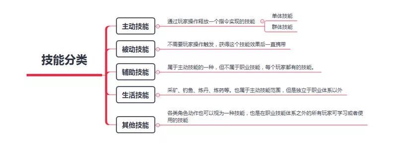 在整个ARPG的游戏体系中,不论什么职业,一般都将技能分成几个不同的类型