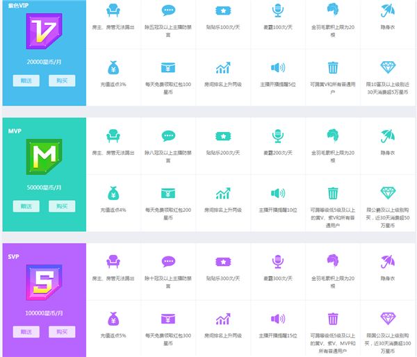 下图为酷我秀场VIP设计,共分为四类VIP,VIP特权根据不同等级的处理权限而设,通过禁言,踢人,麦霸等对抗性权限设置,区分不同玩家的身份,进而刺激用户疯狂充值和消费,而不同的vip标签进入房间,主播都会很客气的说一声:“欢迎XXXX进入房间,"给用户一种瞬间当土豪的感觉。