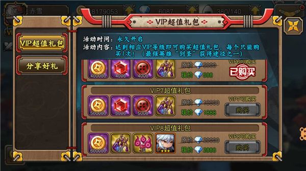 游戏中不仅仅设置了VIP特权,还有特权礼包,其中VIP8级可以直接购买前排输出暴力英雄剑圣,不同的VIP等级可以购买相应等级的VIP礼包,包含大量人物碎片,武器等进阶道具。我们可以看出,其特权是在已有功能点上,添加限制创造出来的,比如购买体力限制,购买体力需要耗费钱币,本来没必要限制,但是为了体现出不同付费用户之间的差异,通过购买次数的限制,制造出了这样的特权。