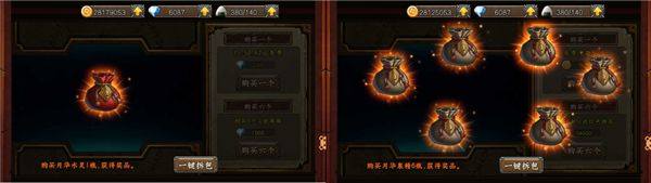 大量卡牌游戏都会设计抽英雄,玩家耗费280钻石可以抽取一个福袋,打开后未必出现三星英雄,如果用户花费1666钻石,则可以开6个福袋,其中必中三星英雄,但是也未必是你希望获得哪个英雄,如下图所示: