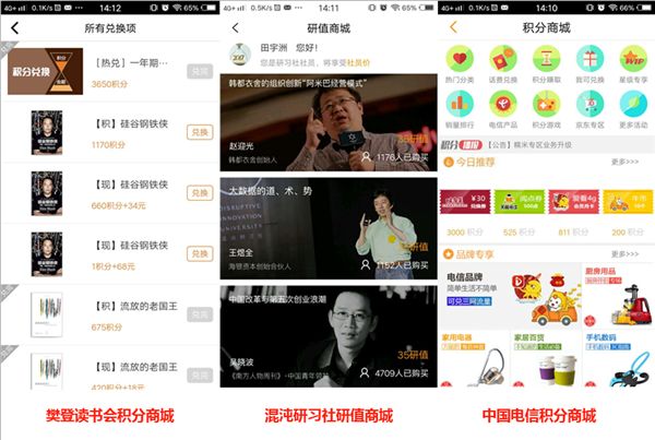 一般电商平台的积分系统与游戏中的“道具购买”逻辑相似,以电信的积分为例,根据每月话费,电信运营商会提供积分反馈奖励,鼓励我的流量使用和付费行为,而积分可以在积分商城中购买京东商品,各类视频平台会员,各种优惠劵等,积分如同金币,用户通过付费或者参加电信活动积累金币(积分),通过购购买商品消耗积分。如樊登读书会的每日签报送积分,推广一个用户注册购买樊登读书会一年会员则可以获得600积分。而其积分商城中提供两类换购,一种是纯积分换购,一种是积分+现金换购,后一种模式类似于金币+钱币换购道具。我们再来看混沌研习社,其中的研值可以理解为金币,用户通过观看直播,写微作业,分享,每周学习时长进行兑换,而混沌研习社比较聪明的是研值商城中没有实物物品,将牛人们的课程打包进行研值销售,边际成本几乎为零。这种形式几乎可以应用在所有服务中,促进用户操作,赠送“金币”,通过零边际成本服务封装打包,让用户消耗“金币”。