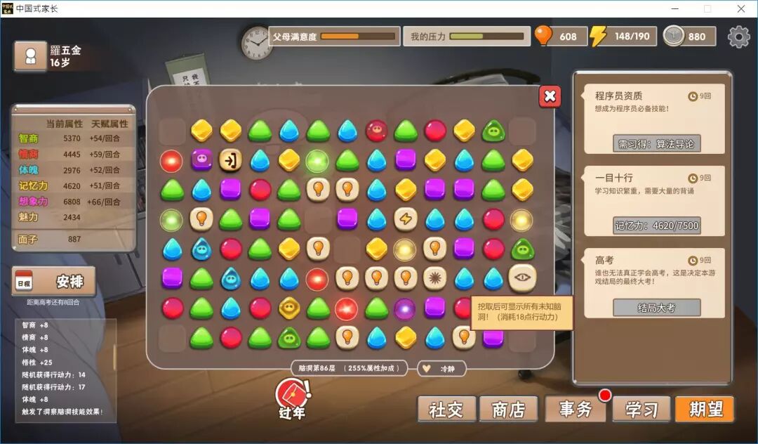 数值系统方面,有各种不够合理的设计。本作将0岁到18岁分为48个回合,每回合使用行动力来“开脑洞”、做试卷增加属性,或者打工增加金钱,无需行动力的随机事件也能提供一定的属性增减。