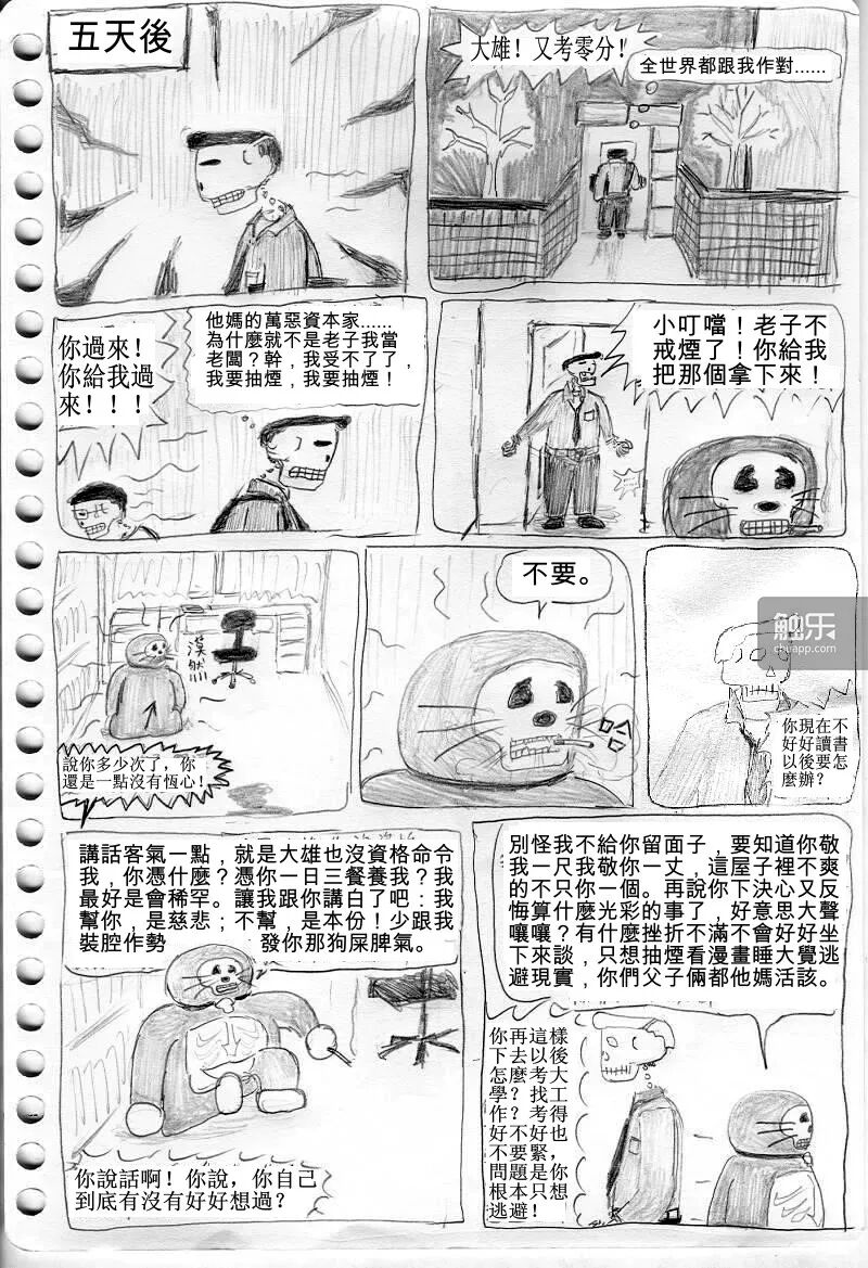 我在2005年画的同人漫画《小叮当X》第10话《戒烟》,安排给大雄妈妈的画外台词“考得好不好也不要紧,问题是你根本只想逃避”,用意即在不让她显得唯分数是尚,显得刻板,还是把小孩的人格发展放在首位,谨供参考