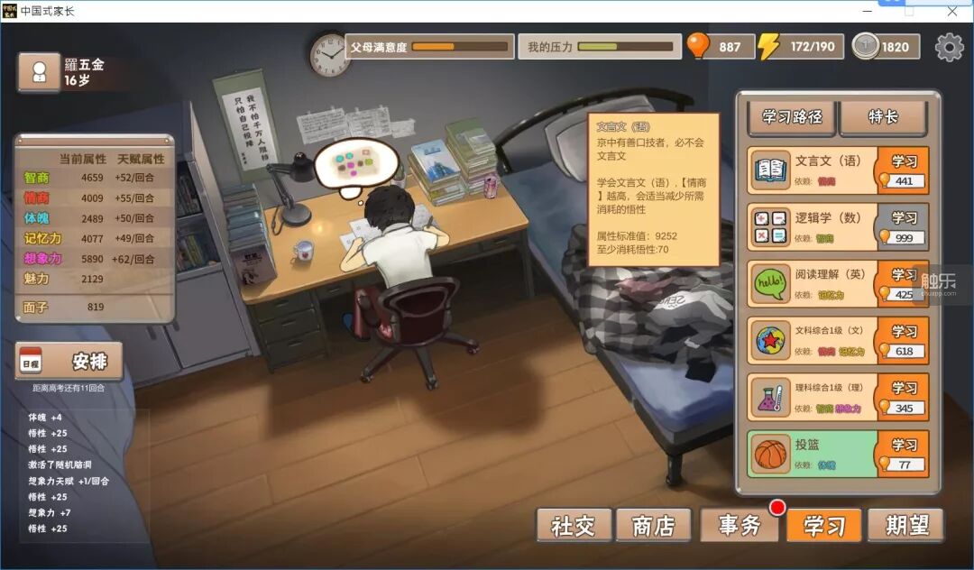 无论《中国式家长》的制作组想不想、能不能比照《太吾绘卷》的模式来重构NPC的系统,我会建议下一个想做模拟教育和高考的制作组往这上面来用功。