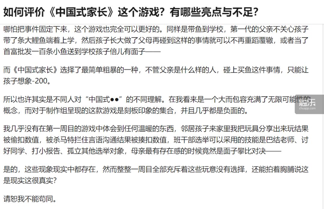 不能期望现在的《中国式家长》或今后的哪一款就能做得非常好,然而这总会是一个高分的申论题,并且也会是一个能让游戏界与教育界以平等、友善(而非针锋相对)的姿态,展开深度交流(而非各说各话)与合作(而不只是沾光、利用)的问题。