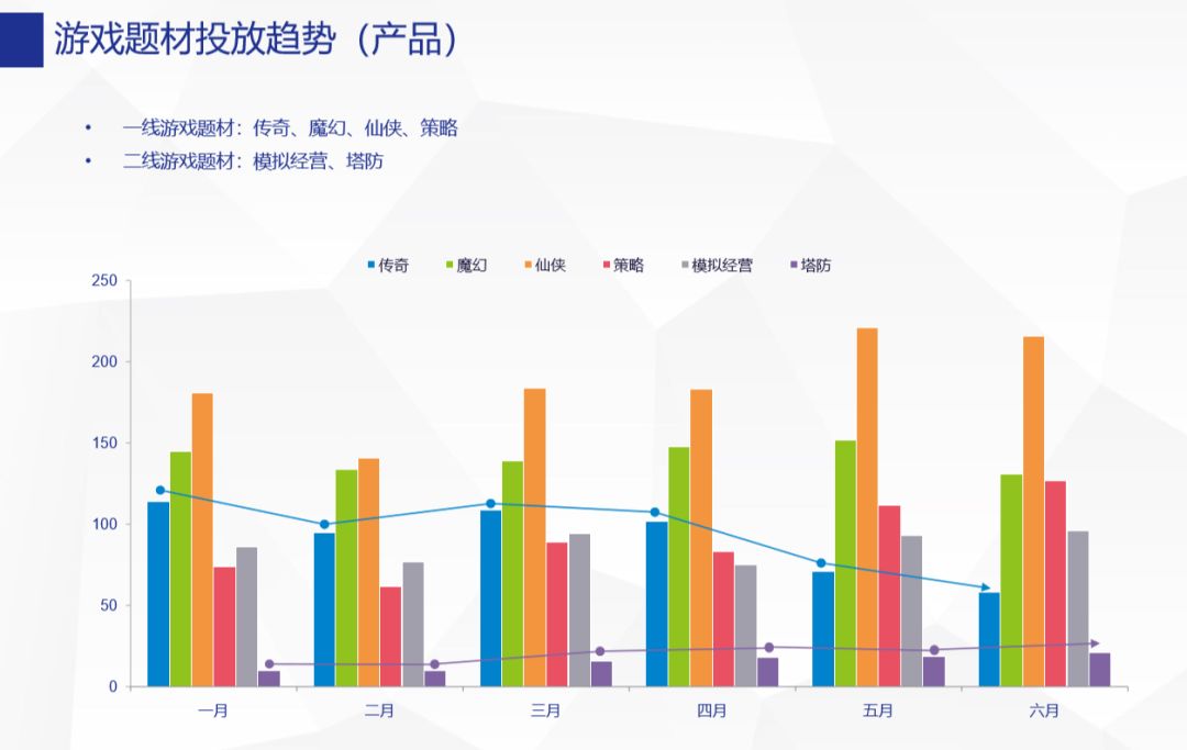 从整体买量的盘子上来看,目前主要买量品类仍然集中在传奇、仙侠、魔幻等传统类型上。DataEye买量平台也数据显示,在每月的素材投放力度TOP10中,以上主流品类基本能够占据七成以上的席位。