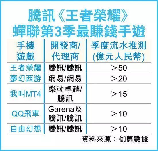 据伽马数据统计,《王者荣耀》的第三季度流水超过了50亿元,约为《梦幻西游》的2.5倍、《我叫MT4》的3.3倍、《QQ飞车》和《自由幻想》的5.0倍...这些落后数倍的产品,已经是在Q3营收表现排名前列的几款。