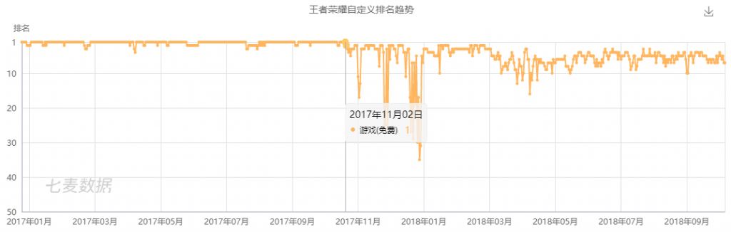 其中最直观的体现,是在App Store游戏免费榜的排名上。据七麦数据显示,在2017年11月2日之后,“王者”便再无登上免费榜Top1,而当天正是首款“吃鸡”手游《小米枪战》上线的日子。