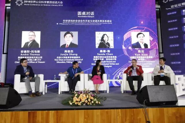 在论坛最后的圆桌对话环节,曹颖、安德烈·托马斯、桑德·陈,尚俊杰,肖云就“科学游戏的全球合作开发和资源共享体系建设”问题展开了讨论。