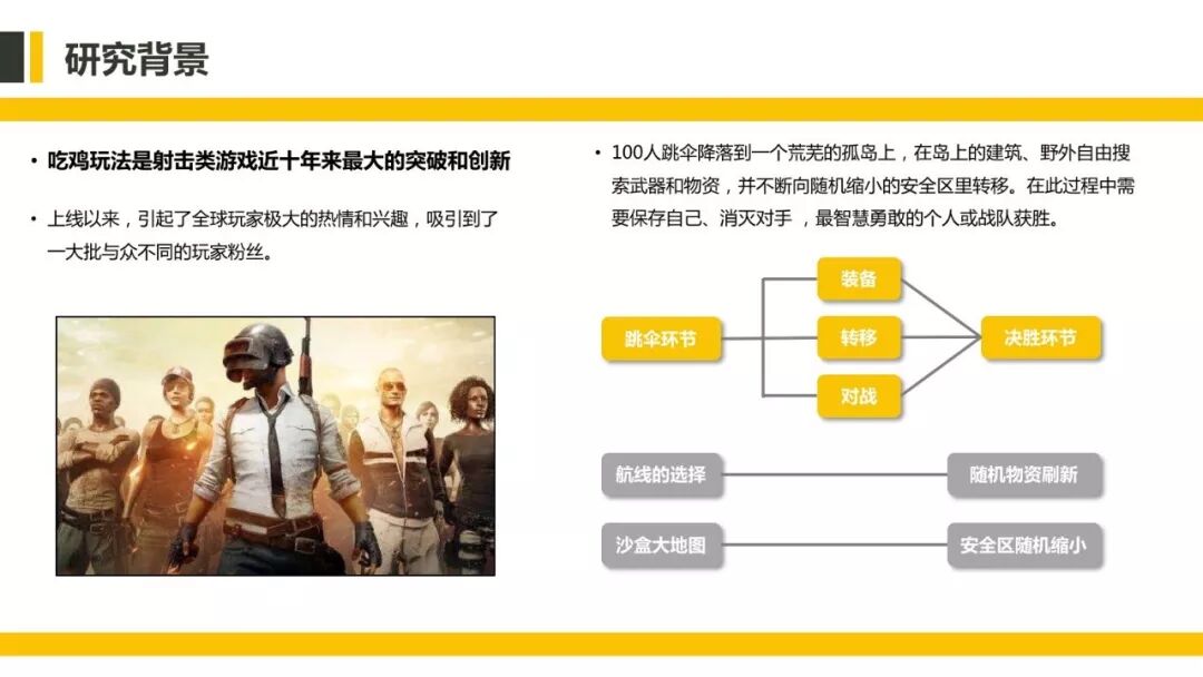 我们这份报告所写的吃鸡类游戏(《绝地求生:刺激战场》),是射击类游戏近十年来的最大的突破和创新,超大场景的地图和较高的自主性,带给玩家全新的体验。