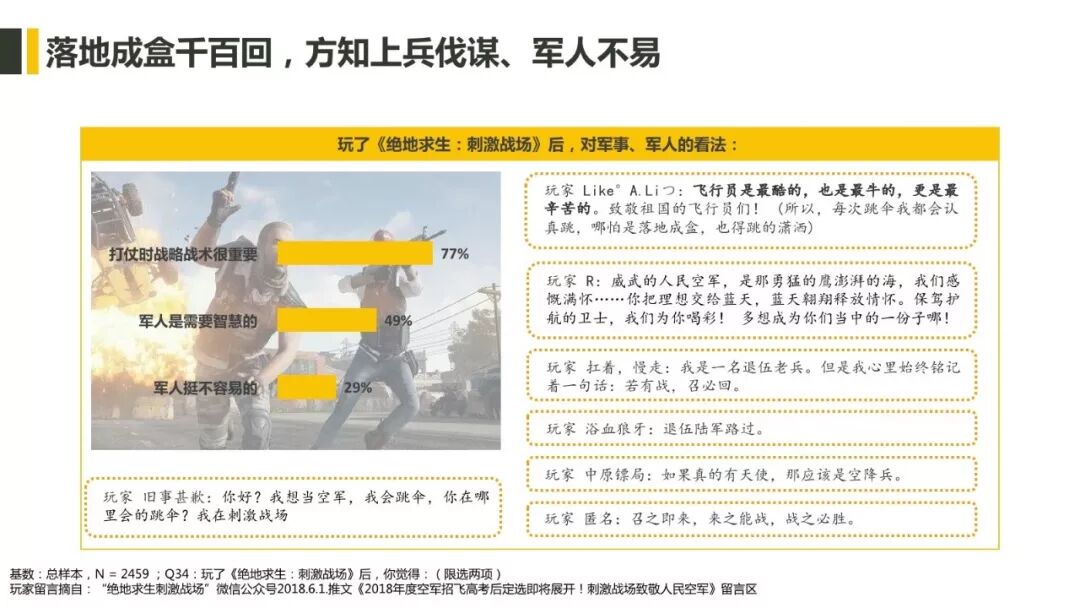 ▲ 玩过吃鸡游戏之后,近八成玩家认识到战略战术的重要性,近五成认为军人是需要智慧的。