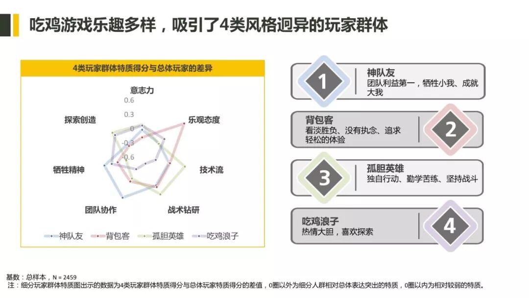 ▲ 存在四种细分玩家类型:神队友、背包客、孤胆英雄、吃鸡浪子;