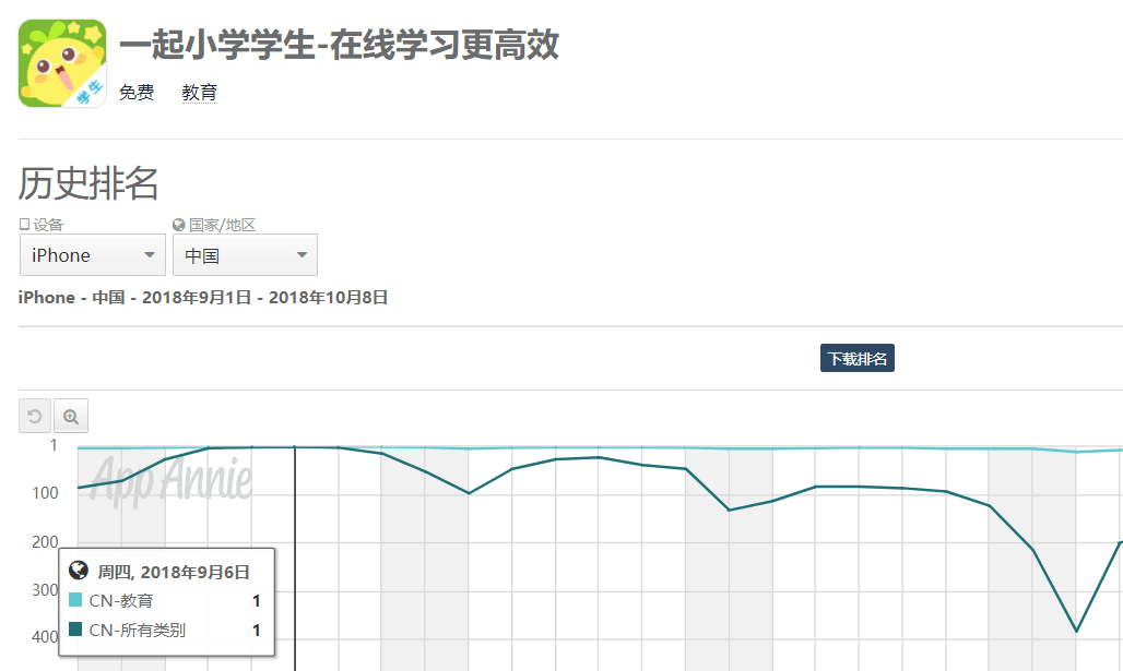 · 改名为《一起小学》后,该APP的学生版在2018年9月开学季下载量迎来历史高峰,9月6日登上App Store下载榜第一。