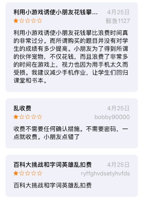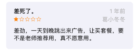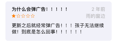 简而言之就是,“孩子乱花钱不怪我们”和“受到广告误导也不怪我们”。不过相信大多数人在面对用户协议的时候都是直接略过,但是对于一款教育APP中出现非正常充值和广告还是挺奇怪的,所以,这也是该APP倍受差评的主要原因之一。