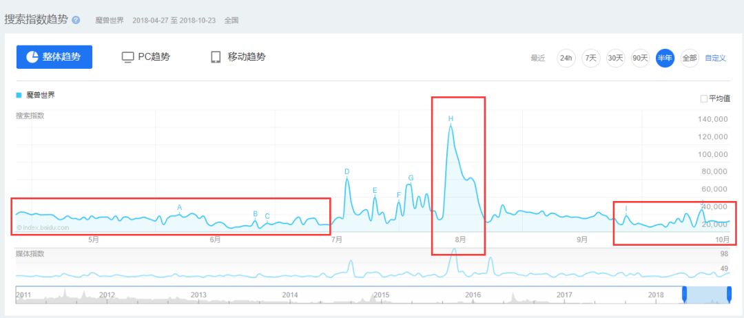 以关键词“魔兽世界”在百度的搜索指数为例,8月14号8.0新版本上线当天达到近半年来的最大值,之后便迅速回落,到10月的时候,热度甚至有时还低于新版本上线前