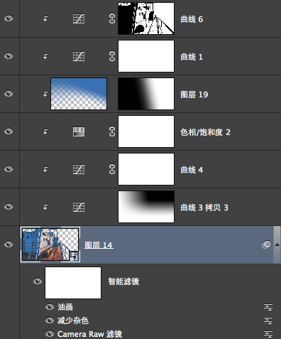 这里我主要添加了三个滤镜,依次为: Camera Raw滤镜、减少杂色、油画。