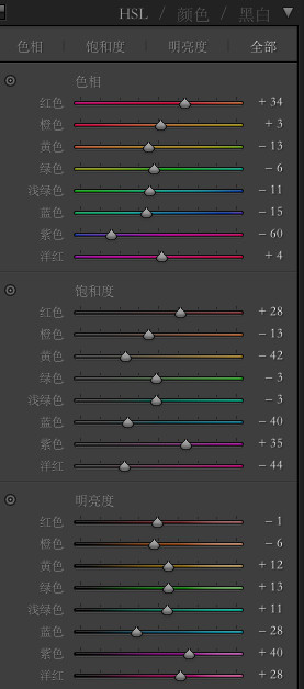 接下来调整HSL(色彩模式)的参数,通过对色相(H)、饱和度(S)、明度(L)三个颜色通道的调整达到满意的画面效果。