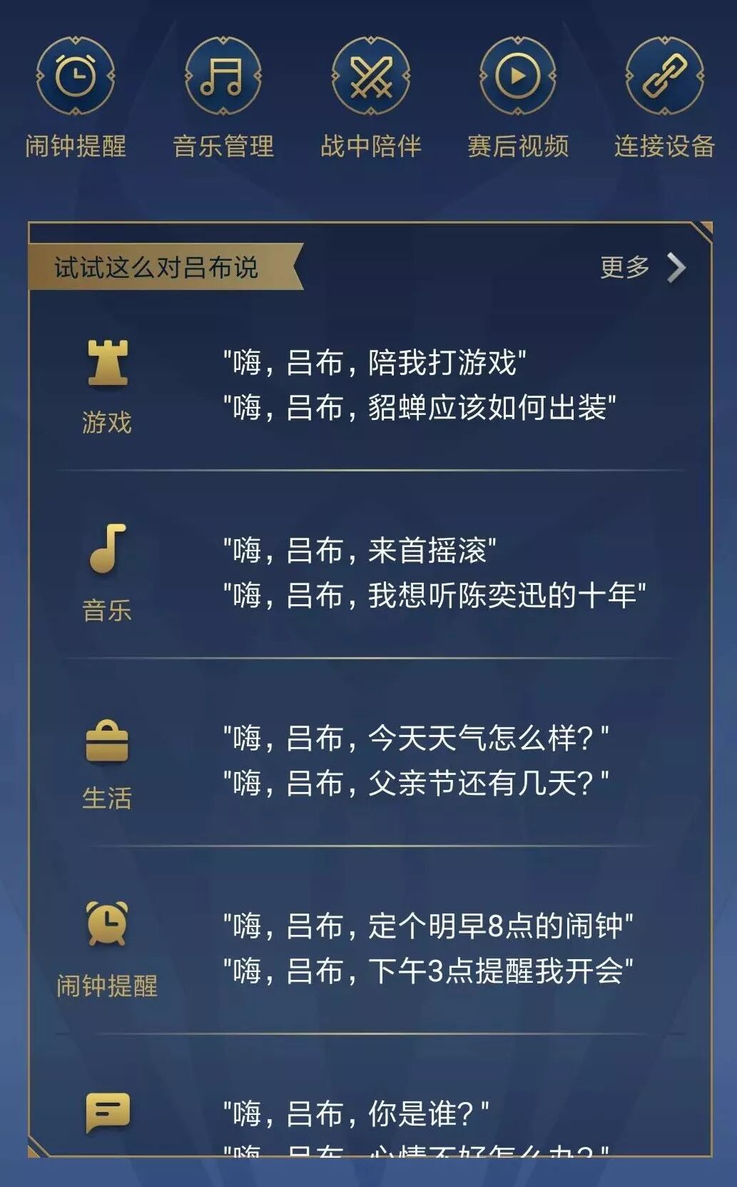 这时打开吕布机器人App,目前版本显示有闹钟提醒、音乐管理、战中陪伴、赛后视频等功能,包括一些应用示例。