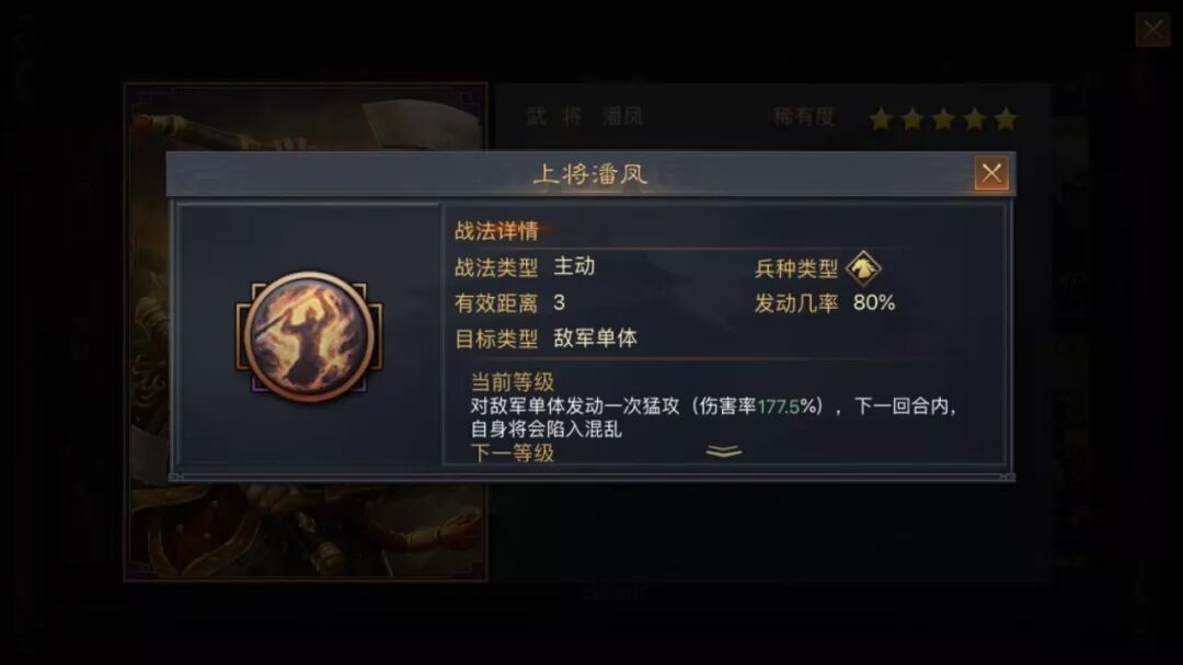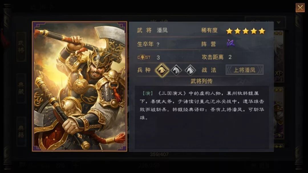 在《率土之滨》中,武将的战法名称一般也都非常有讲究,比如刘备的“皇裔流离“、关羽的“挂印封金”、张飞的“长坂之吼”、黄忠的“定军扬威”,都和人物在历史上的背景、事迹或典故有关,而潘凤的战法就是“上将潘凤”,可能是实在没有其他更适合的词适合这个角色了。“吾有上将潘凤,可斩华雄”,就是对于潘凤这名角色的最佳注脚。