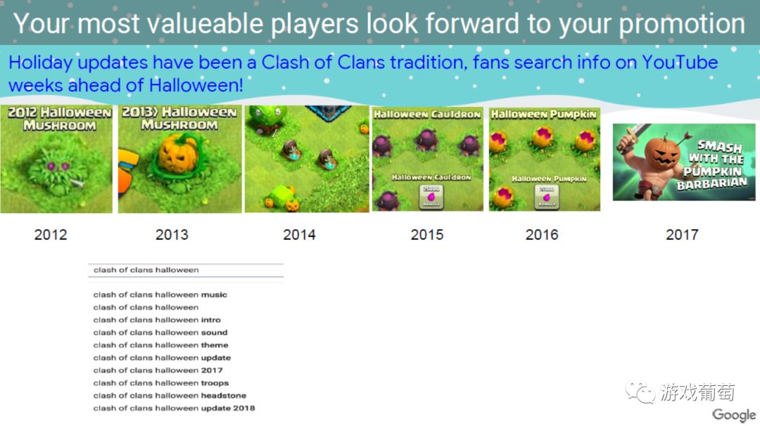而Supercell的《部落冲突》就一直保持着在节日期间推出运营活动的习惯。以万圣节为例,该游戏的海外用户在万圣节前几周就会在YouTube上搜索相关的活动视频。值得注意的是,由于Supercell对美术素材和运营活动的逐年优化,去年的万圣节预热视频在Youtube上获得了800万点击和93万的点赞。