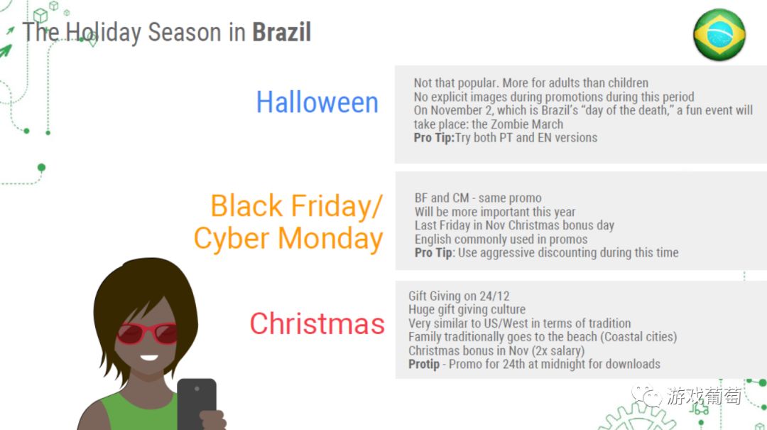 巴西在黑色星期五/网络星期一和圣诞节适合举办促销活动。其中在巴西,11月的最后一个星期五是巴西的圣诞节奖金日,此时一般会有双倍工资,12月24日也有送礼物的习俗。这些时间点均可以重点推出一些圣诞主题的活动,吸引用户的下载和付费。
