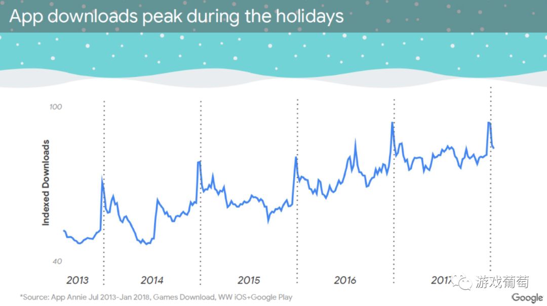 受到感恩节和圣诞节的影响,12月日均应用安装数量均为平时的2.2倍,并在1月达到安装峰值。