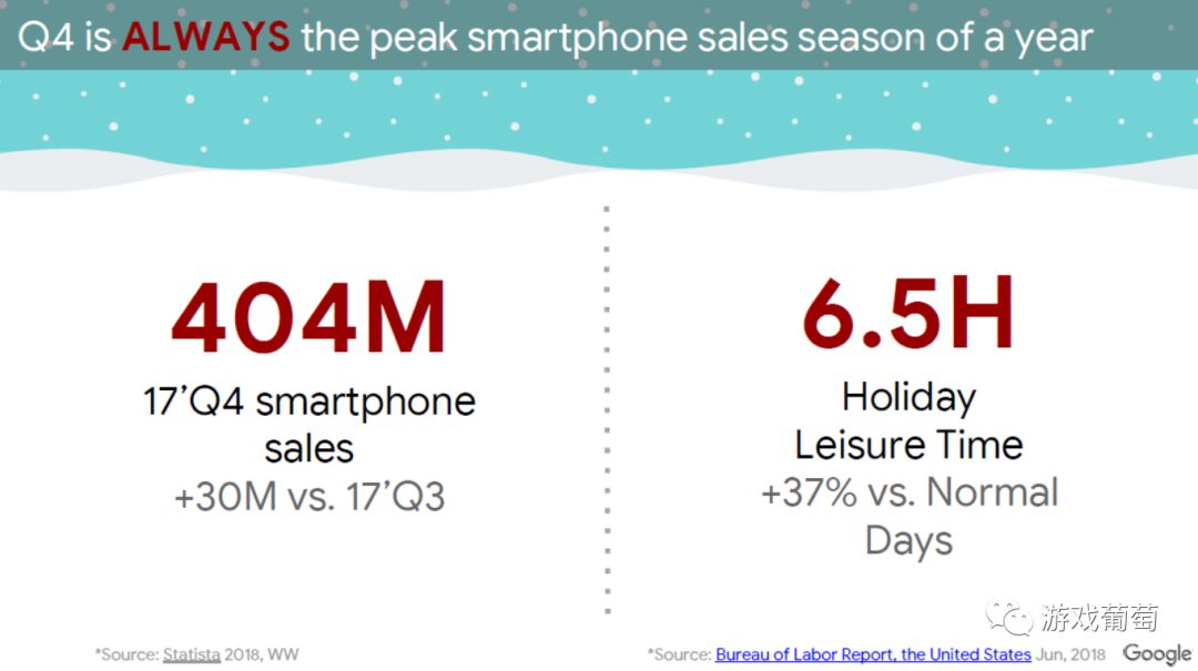 从全球市场来看,每年的第四季度都是智能手机的发布和销售旺季。根据Statista提供的数据显示,去年Q4全球智能手机销量超过4亿部,相比去年Q3增加了3000万部。手机销量快速增长的同时,应用商店礼品卡也经常作为这段时间的节日馈赠礼物。
