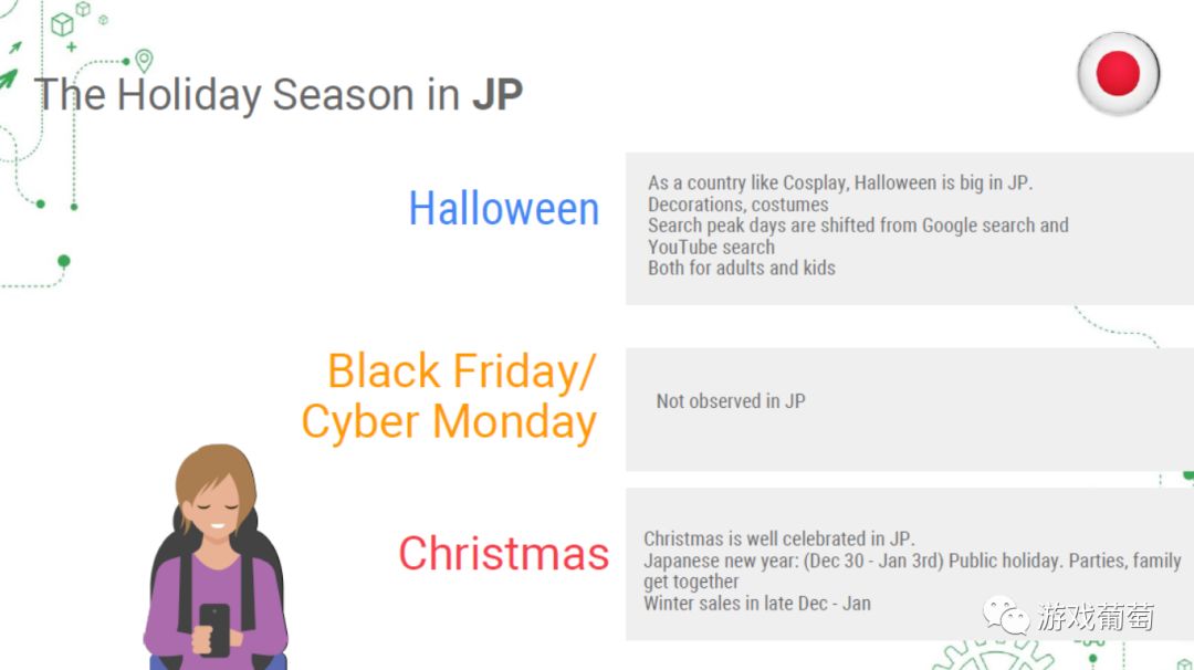 在日本,万圣节、圣诞节都是较为重要的节日,12月30日至1月3日是新年假期,冬季折扣时间为12月底至1月底。厂商针对这些时间段,进行游戏的活动推广和上线,同样能够给用户量和收入的增长带来比较大的机会。