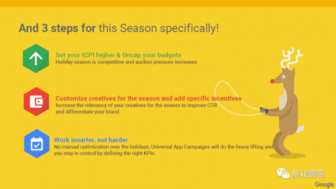报告最后,针对节日运营活动给出了三点建议。第一,由于假期游戏产品竞争激烈,会因此推高竞价,此时需要考虑提高tCPI,并根据实际情况提高或取消每日预算上限。第二,厂商需要为假期定制能够吸引用户点击的创意内容,并添加具体的激励措施,增强创意内容与该季度的关联性,提高CTR。第三,在设定KPI后,可以使用通用应用程序(UAC)来控制游戏的广告表现。