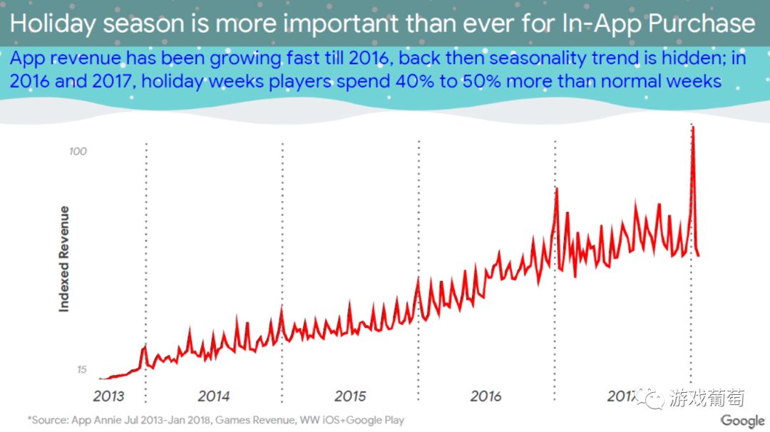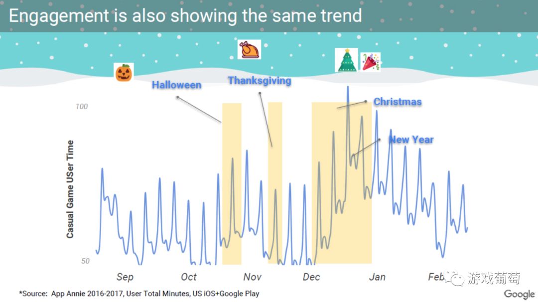 另外,海外用户在假期的游戏时长也有明显增加。比如美国在假期的空闲时间有6.5小时,比平时要多出37%。从2016年和2017年来看,用户在节日期间的游戏消费,要比平时高出40%至50%,这也成为游戏产品全年营收中非常重要的机会。