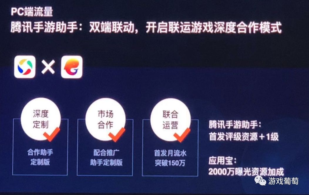 而如果产品与应用宝和腾讯手游助手同时合作,那它在腾讯手游助手上的首发评级资源将增加1级,在应用宝上也会获得2000万曝光资源的加成。可见腾讯对此事的推进力度。