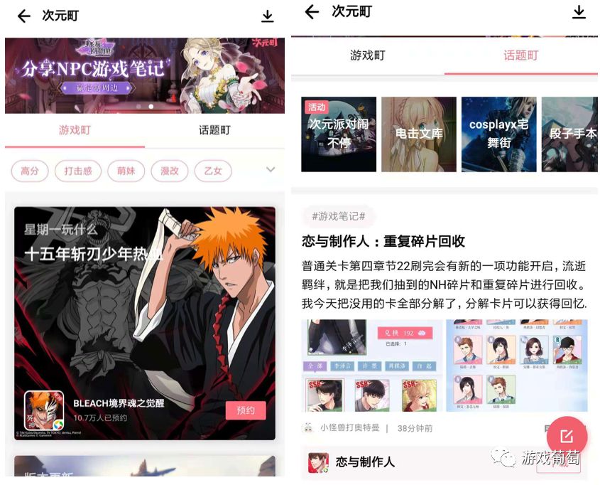次元町氛围“游戏町”和“话题町”,游戏町中会有不同游戏的大图推荐,并提供了一些标签供玩家勾选;话题町则更有社区意味,在不同的游戏笔记下,会放置引导玩家下载游戏的链接。
