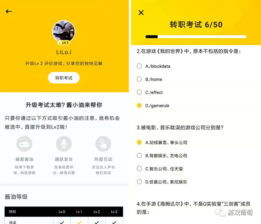 在游戏页面中,每个玩家可以根据“可玩性”、“表现力”、“操作性”、“创新”、“无氪”、“护肝”6个维度进行打分,最终给出游戏的综合分数。不过打分前,玩家要先通过礼仪考试和转职考试,后者共有50道题,题目非常刁钻,只获得了76分。如果不能通过,玩家就需要通过社区行为证明自己。