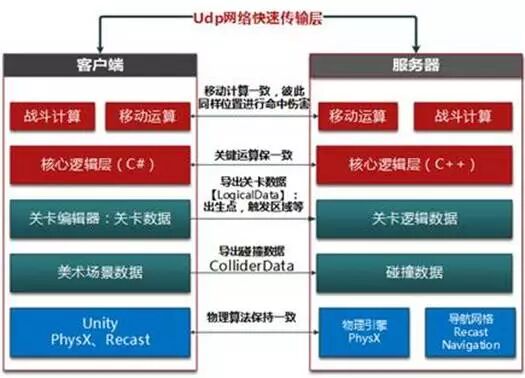 引擎层:Unity的物理引擎是Physx。为了保证两边物理算法一致,我们搭建了基于Physx的物理服务器,并对其作出优化,同时集成了Recast Navigation等高性能引擎组件为服务器提供基础功能。