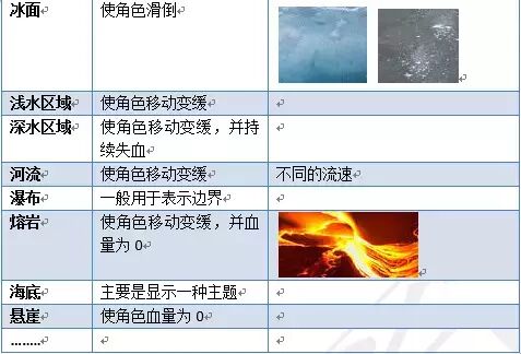 地形不光可以帮助我们丰富游戏内容,展现更精彩的游戏世界还可以以设计不同的游戏效果,这类效果在竞技类或副本类地图比较常见,例如下表: