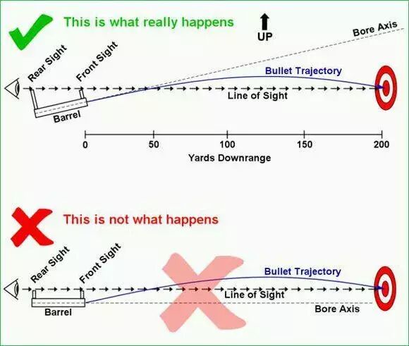 任何在地球上的物体,都会受到地心引力的影响。弹头一出枪口, 加速就停止了。引力会将弹头往地面拉。 所以任何弹头的飞行路线都是弧形的。如果枪管与地面平行, 弹头永远不会和枪管延长线的任何一点交会。所以, 枪管都是微微朝上的。