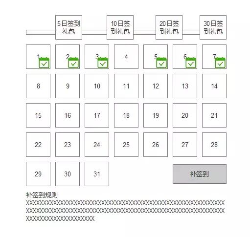 曾经玩过一款PC端RPG游戏,其中的设计更加微妙。玩家连续满30天签到可以得到一个大礼包,如果其中某天没有签到,可以进行补签到,每次补签到消耗钱币,每补签一次花费翻倍。通过这种确定的奖励刺激玩家要么每天签到,一旦遗漏还有补救措施,游戏截图无法找到,大概原型如下图所示: